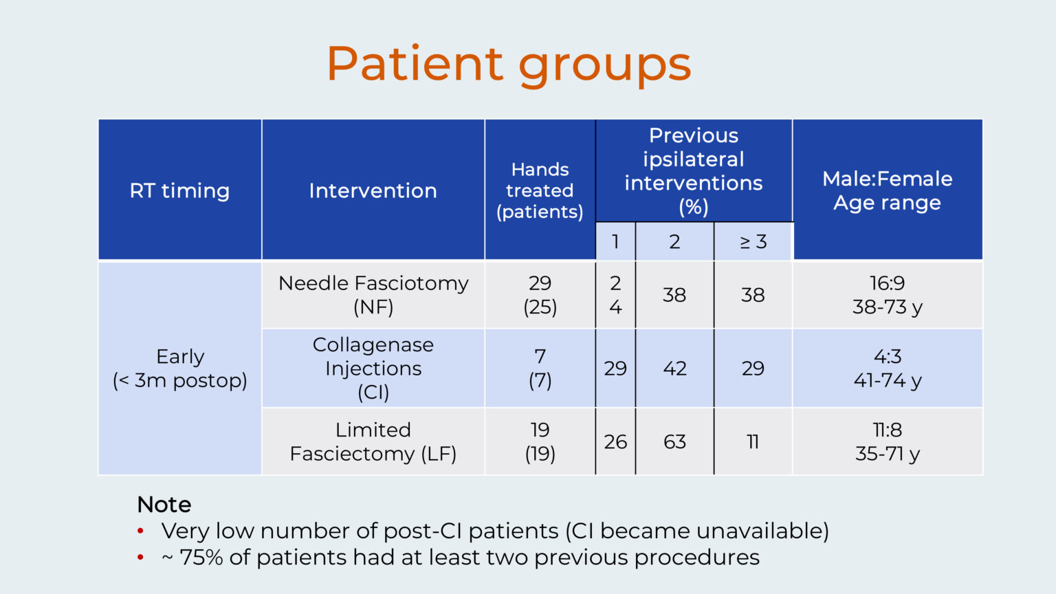 The radiotherapy was always given within 3 months after contracture release. The patient population included more males, with ages ranging from 35-74 years. Importantly, about 75% of patients had undergone at least two previous procedures. Also, collagenase injection became unavailable during the follow-up period, resulting in a very low number of post-CI patients.