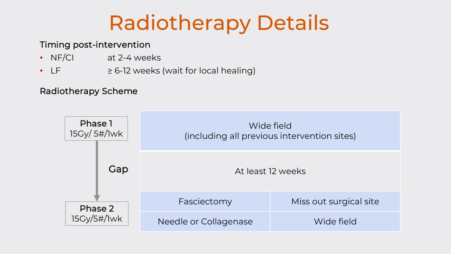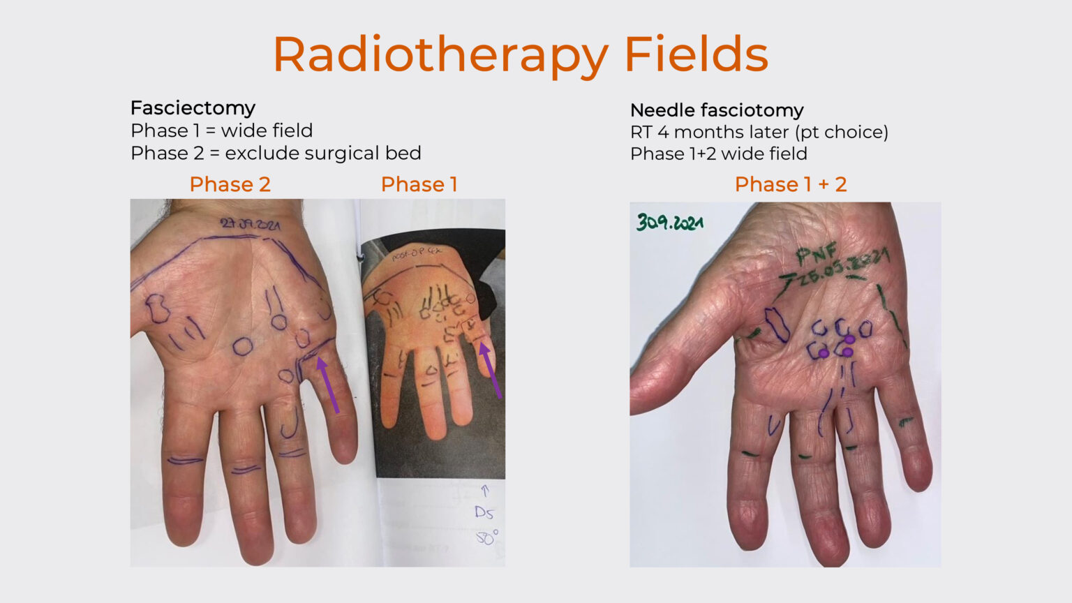During phase 1, all patients received wide-field irradiation that included all previous intervention sites. Following the treatment gap, phase 2 delivery was tailored to the particular intervention: patients who had undergone needle fasciotomy or collagenase injection received the same wide-field treatment as in phase 1, while fasciectomy patients received a smaller treatment field that deliberately excluded the surgical bed to minimize complications at the healing surgical site.