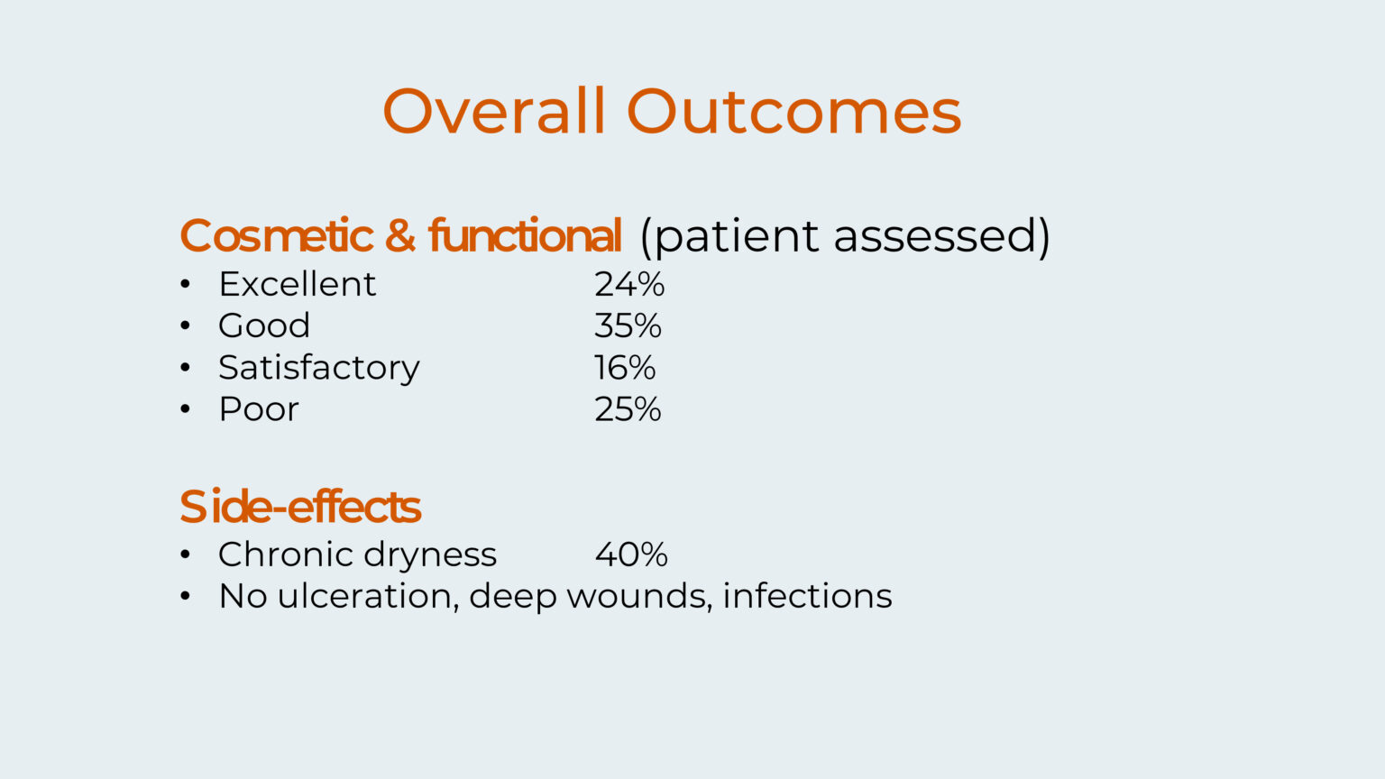 The results of the study showed promising outcomes for the treatment. When patients evaluated their cosmetic and functional results, 75% achieved at least satisfactory outcomes, with 24% rating their results as excellent, 35% as good, and 16% as satisfactory. Only 25% of patients reported poor results.