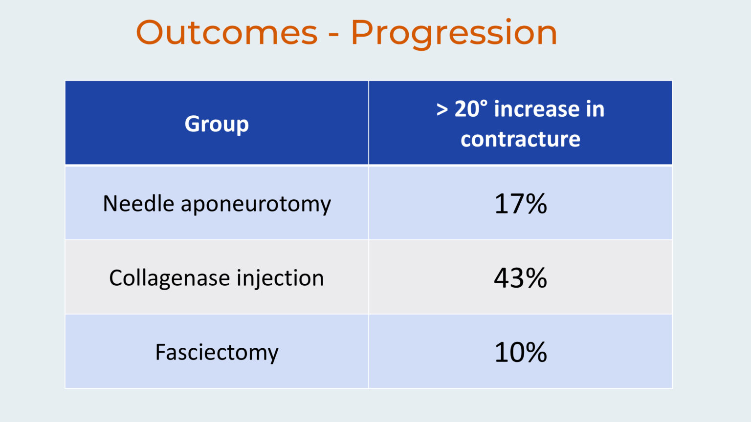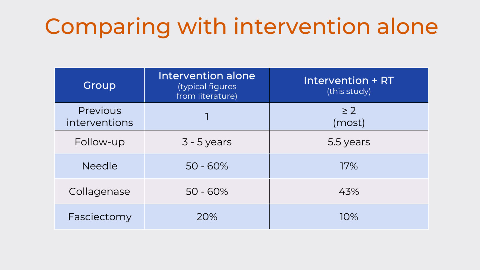 In particular, you would expect a re-contracture rate of 50-60% with needle alone, but when you add radiotherapy it is reduced to 17%. And with fasciectomy you would expect a recurrence rate of 20% and this is reduced to 10% when you add radiotherapy. Because of the low numbers of patients with collagenase, it’s more difficult to draw a conclusion about this part of the study.