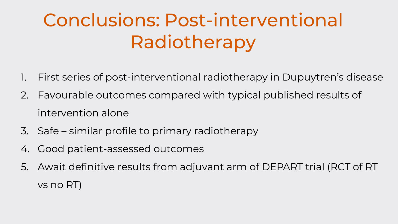 More comprehensive research is needed to establish definitive conclusions and the medical community is currently awaiting results from the post-operative arm of the DEPART trial, which is a randomised controlled trial comparing radiotherapy versus no radiotherapy following intervention and is still recruiting patients in Australia and The Netherlands.